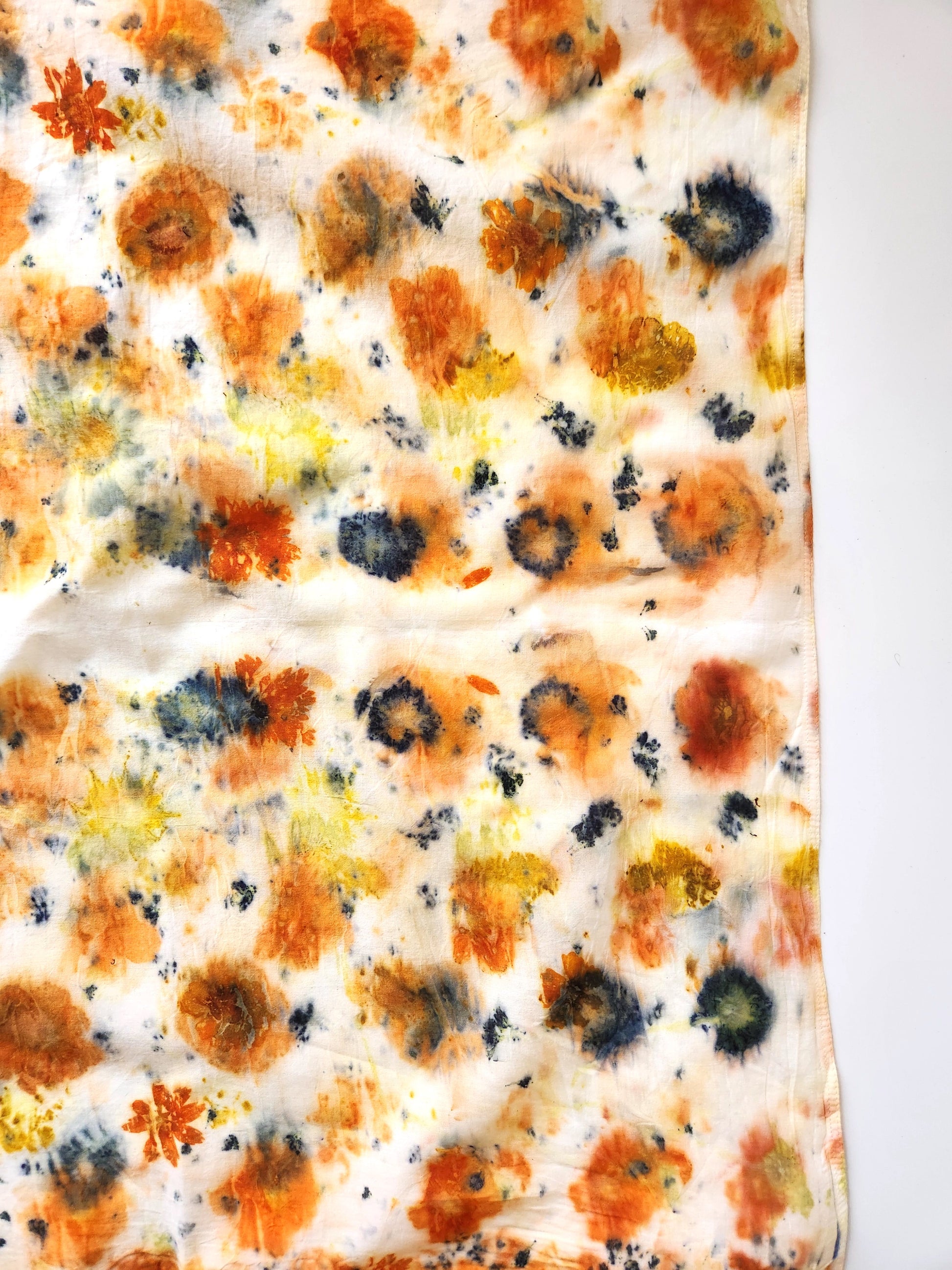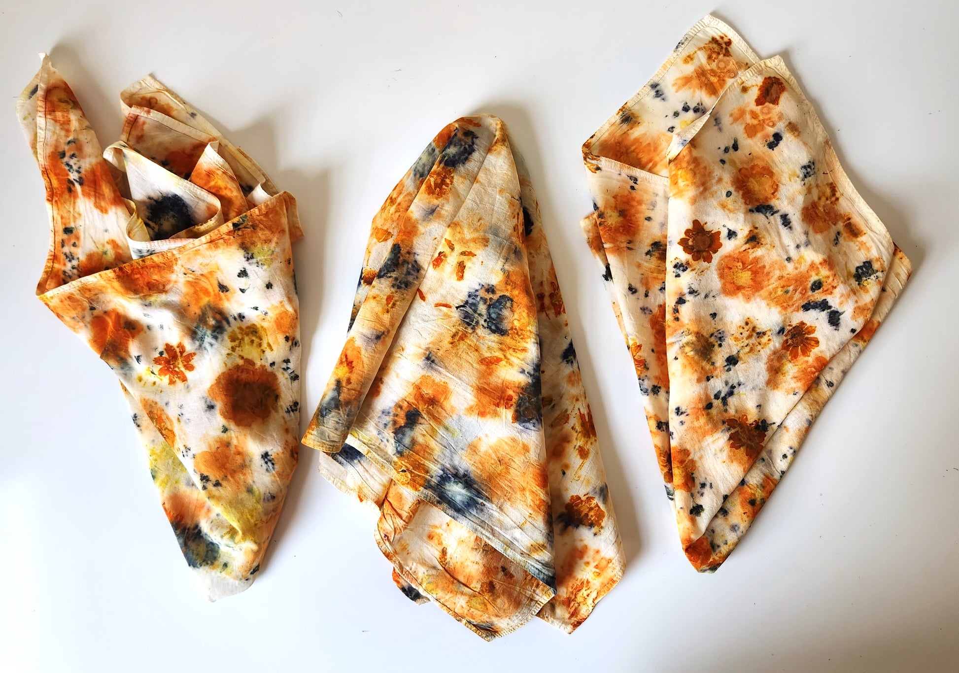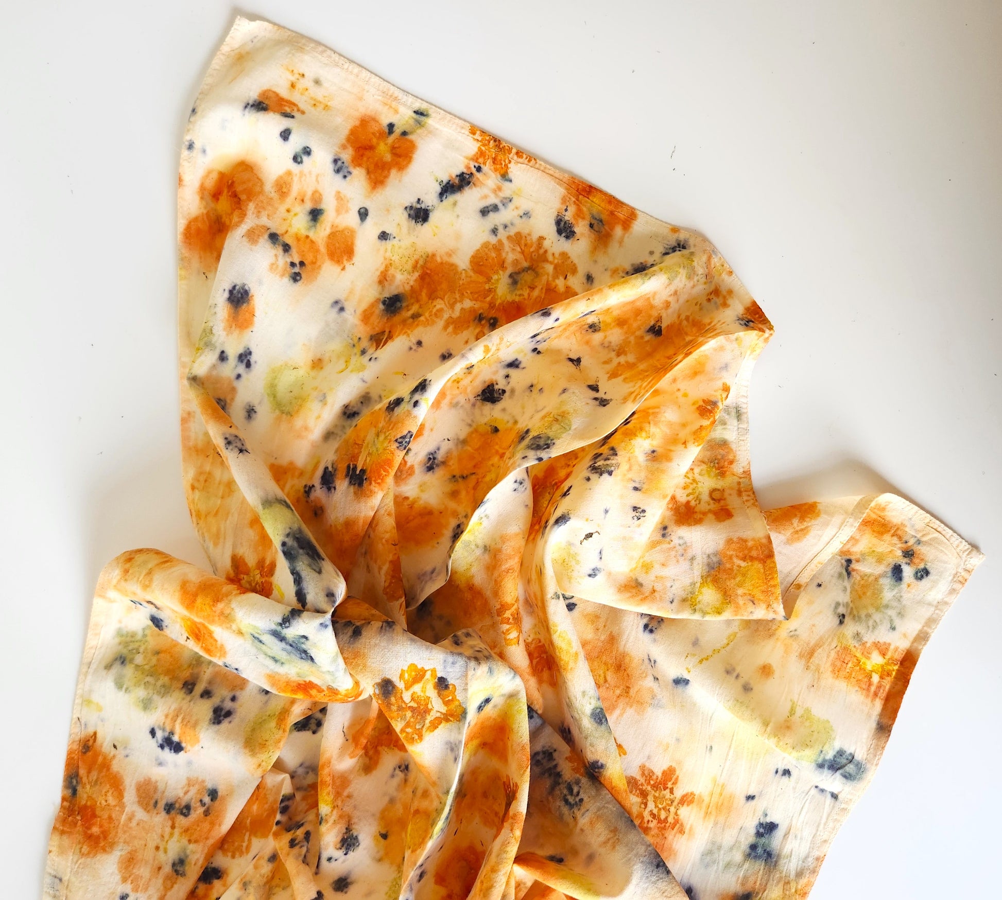 Bandana est teint à la main avec des fleurs cultivées sur place, notamment du cosmos, des roses trémières, de la scabieuse et du coréopsis. Coton biologique super doux et léger, parfait pour toutes les saisons. Chaque conception est légèrement différente.